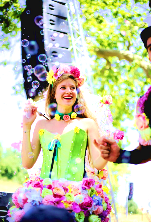 Beautiful flower lady carrying a flower umbrella hand in hand with our handsome flower guy.