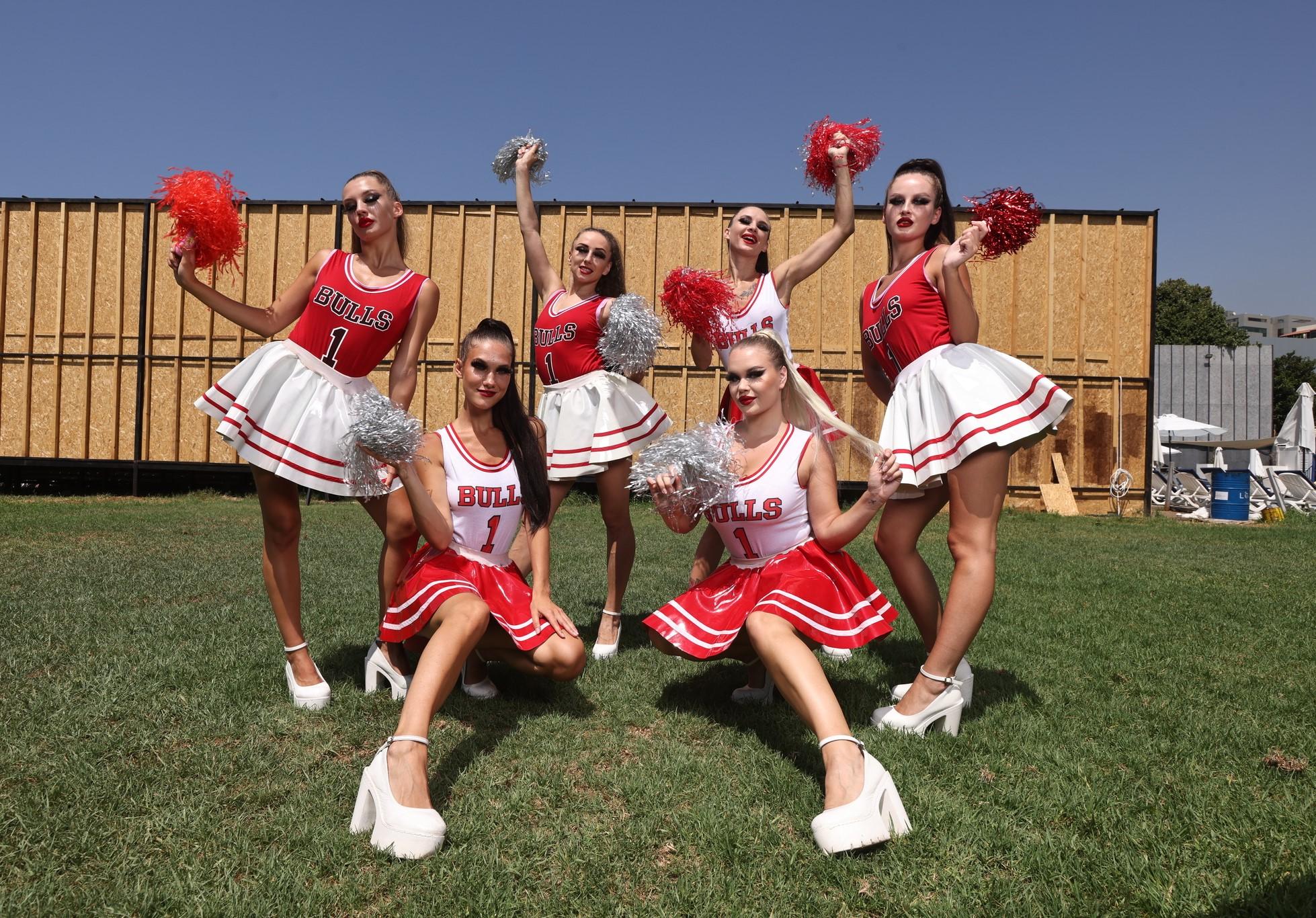 Glamorous cheerleaders themed performers dance a variety of styles from freestyle to staged choreography.