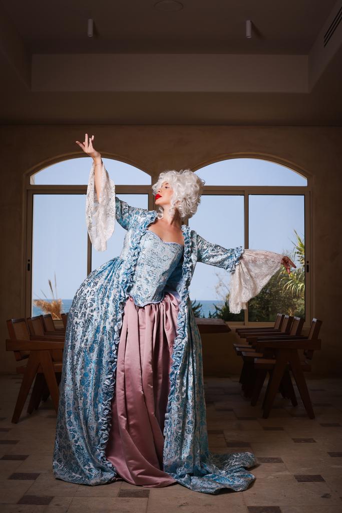 An 18th Century inspired walkabout dame with an extravagantly oversized ballroom dress.
