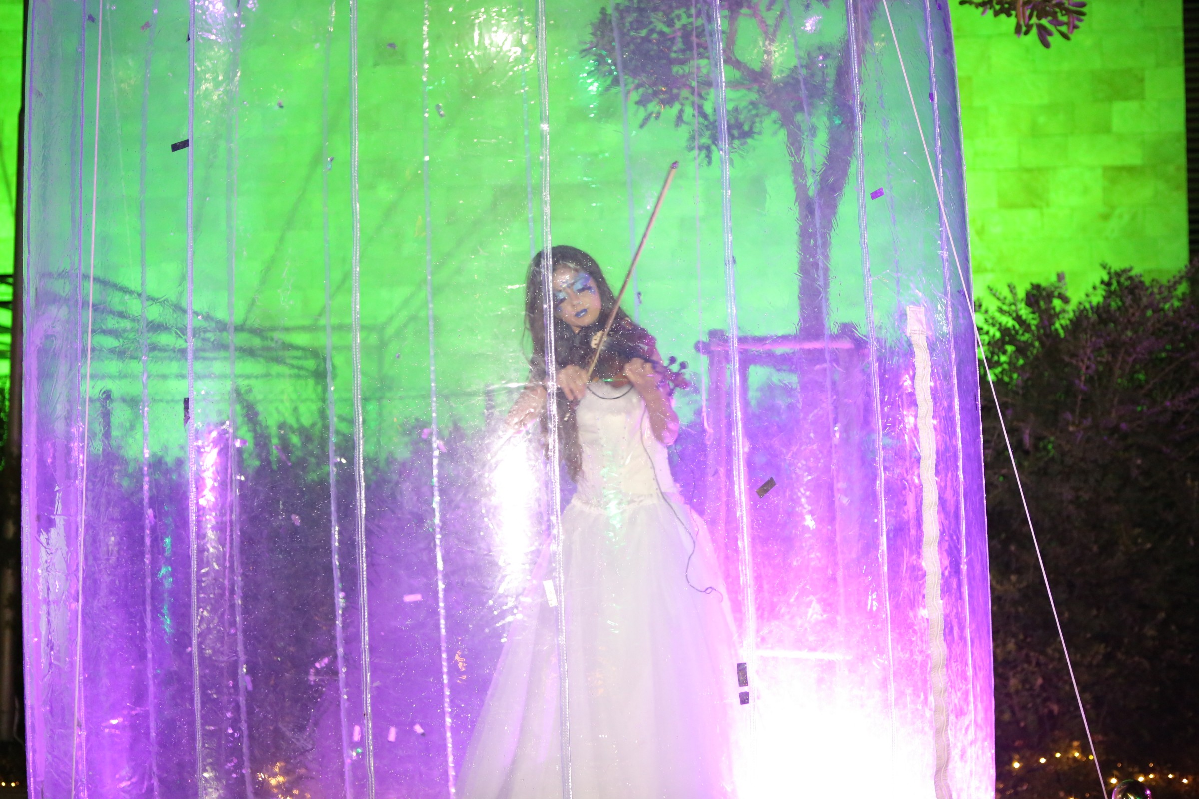 Lavishly elegant led violinist wearing a white gown performing inside a giant globe.