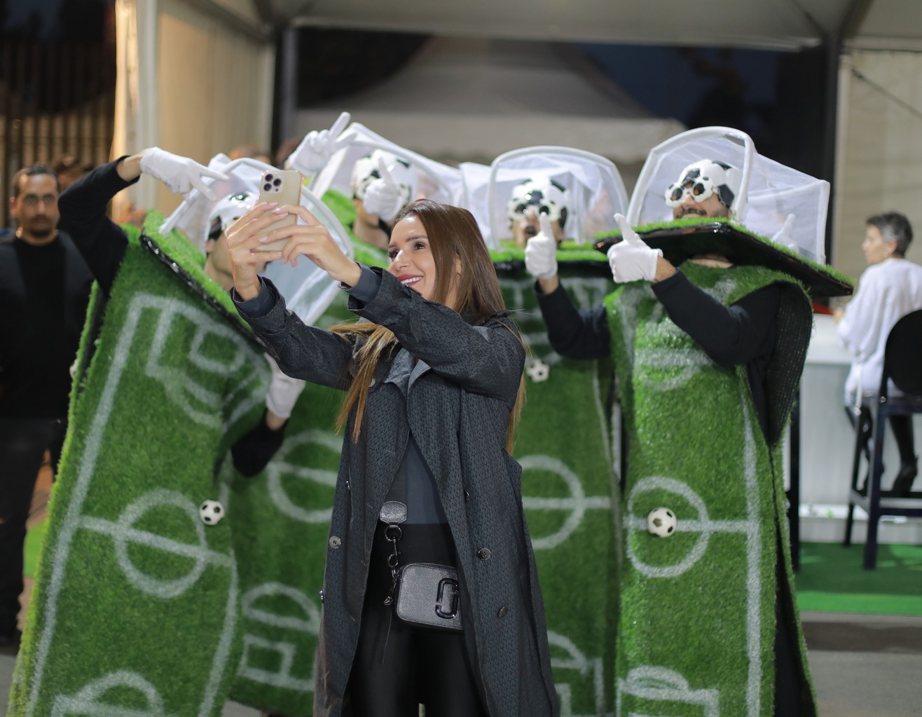 Live human walking football courts, cheerleaders and game stilt walkers.