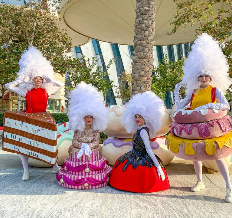 A mixture of cakes, donuts, and cotton candy candy characters.