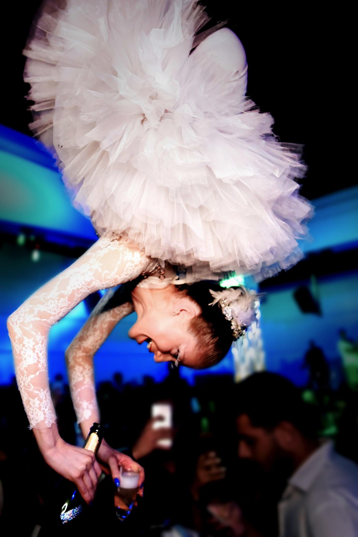 From Champagne to Prosecco, wine to orange juice, this chandelier aerialist serves drinks whilst swinging above your heads.