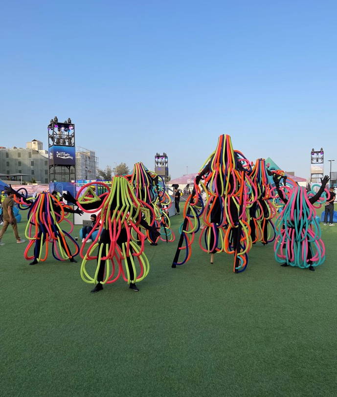 A crazy parade on stilts walkers dancing all around taking over the place.