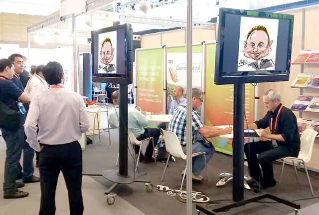 The amazing digital caricatures can be drawn on a tablet and displayed on several displays for all attendees to see.