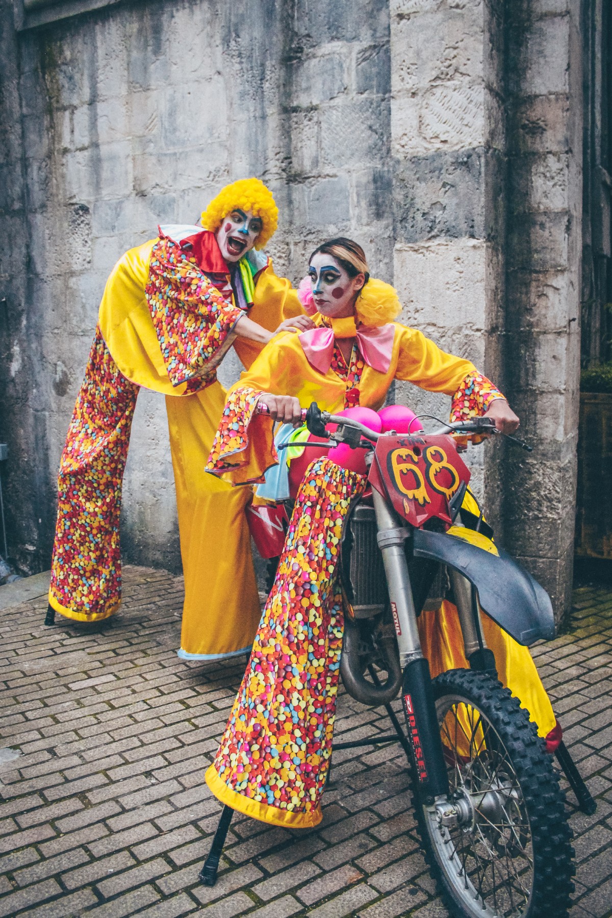 FUNNY CLOWNS ON STILTS