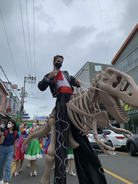 Our wandering dinosaur does a spectacular walkabout show, towering over guests.