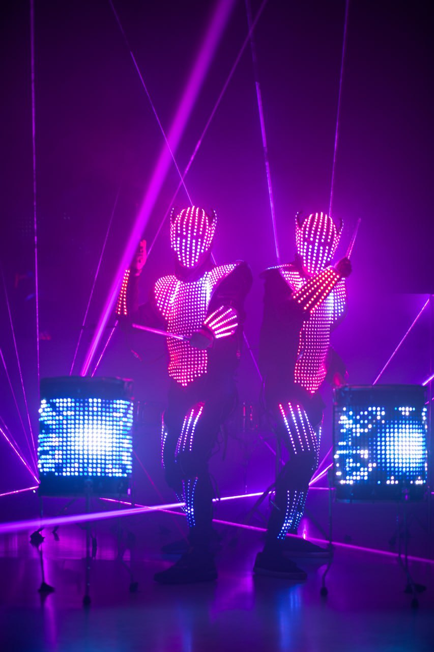 The LED TECHNOLOGICAL ROBOT DRUMMERS show is a cutting-edge performance that uses state-of-the-art technology to create a visually stunning and exciting experience.