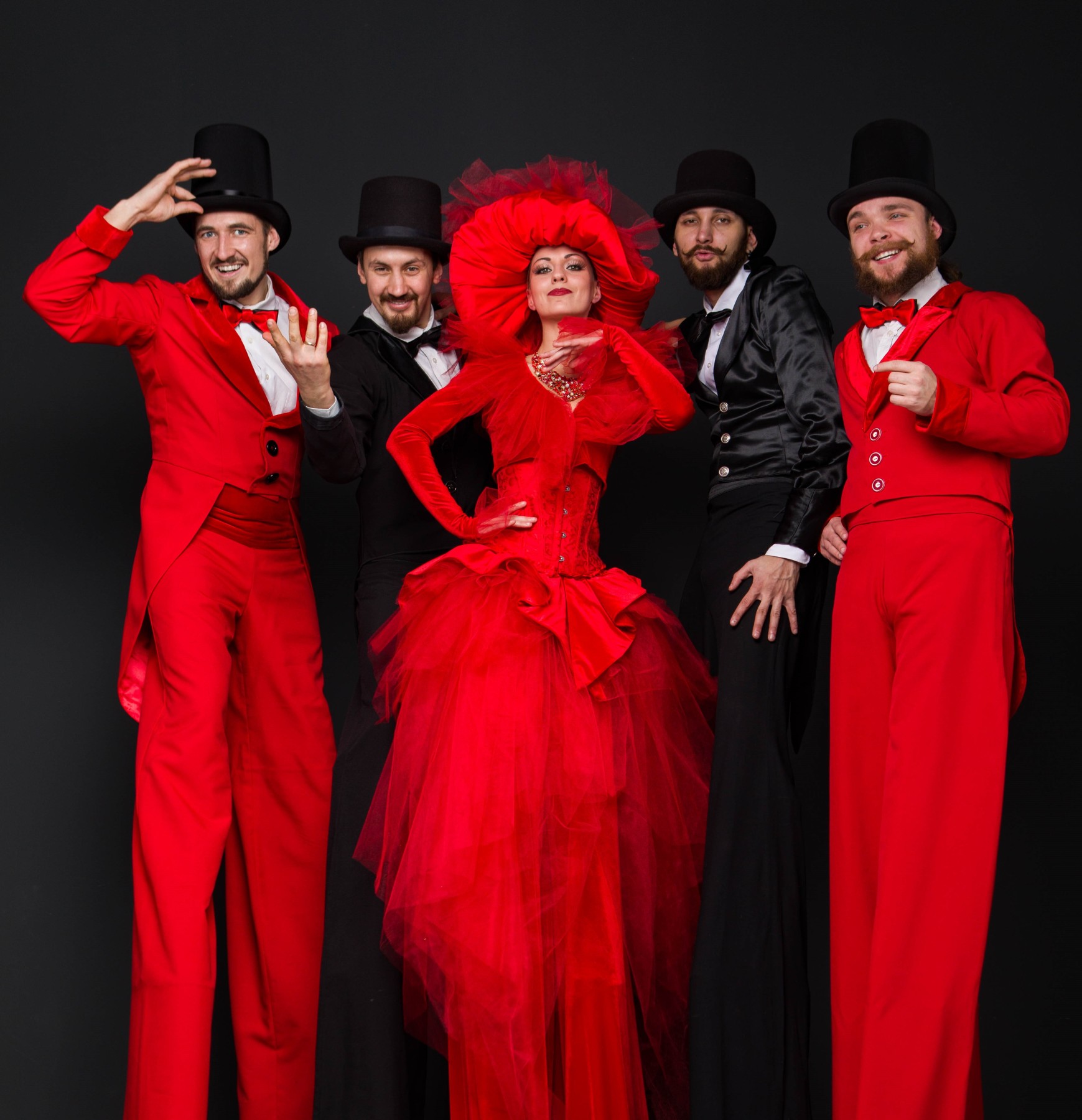 The black and red luxury tuxedo stilt walkers act is a unique and captivating performance that involves stilt walking and acrobatics.