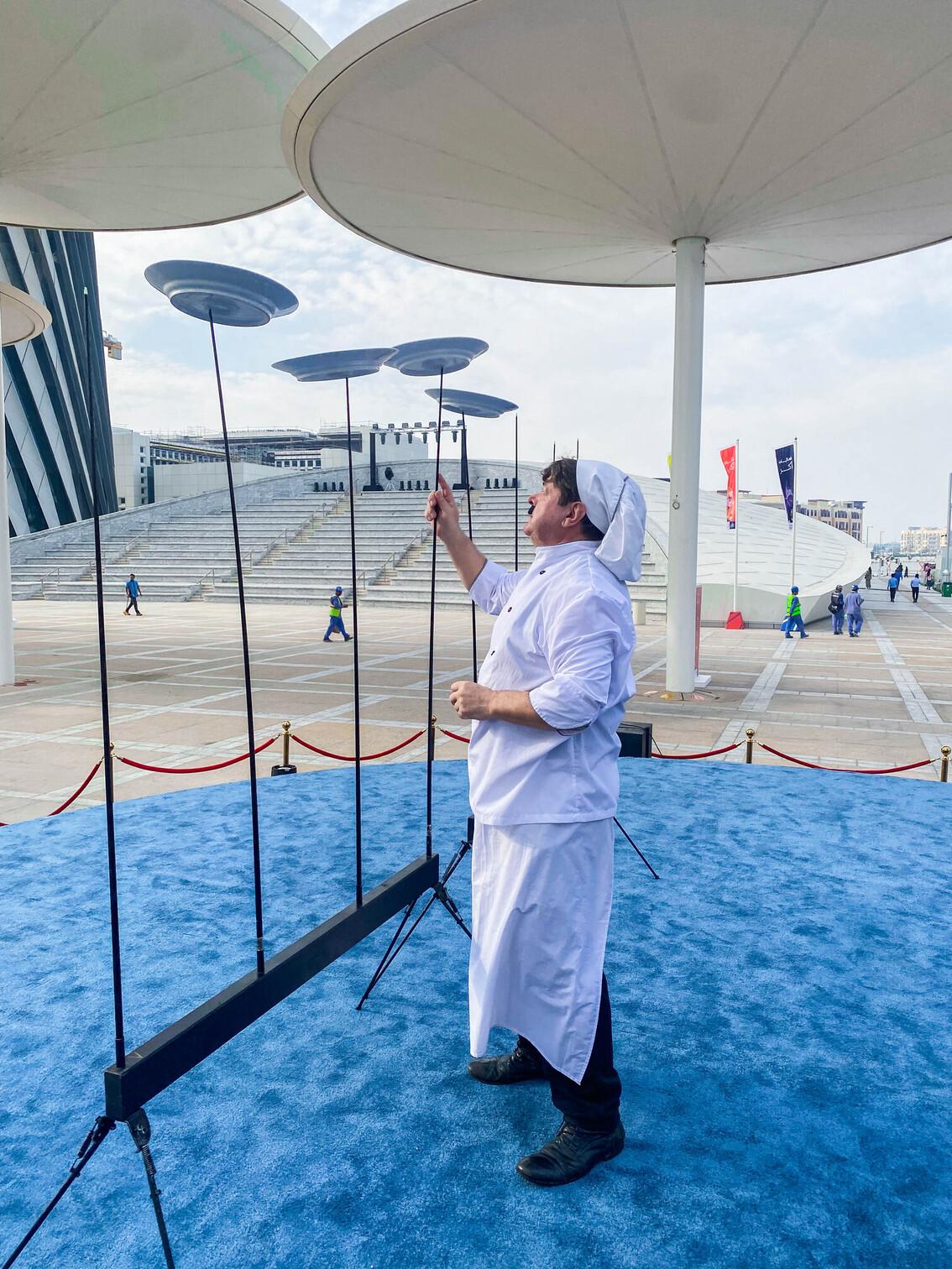 The performer's movements are fluid and precise, with each plate spinning at just the right speed to maintain its balance and prevent it from falling to the ground.