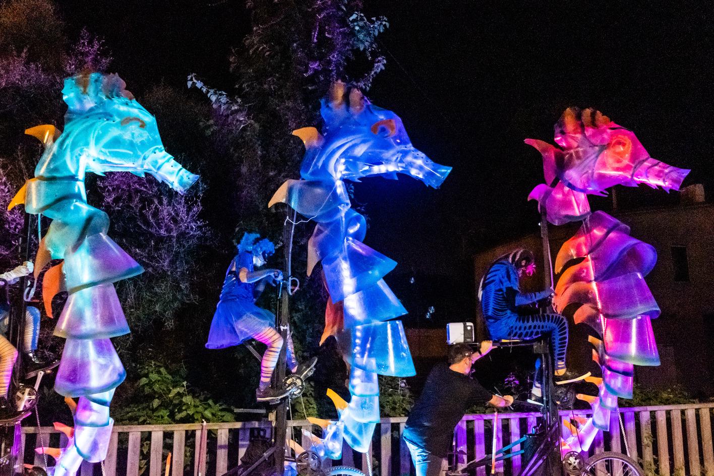 Glowing LED sea giant seahorses are typically larger than life-size.