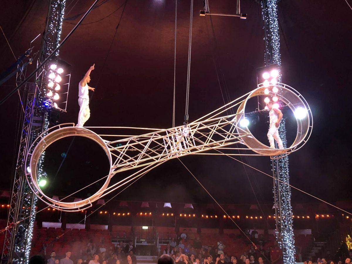 The Acrobatic Cicus Wheeli a performance of a range of tricks and acrobatic maneuvers as the wheel spins, such as handstands, cartwheels, flips, and spins.