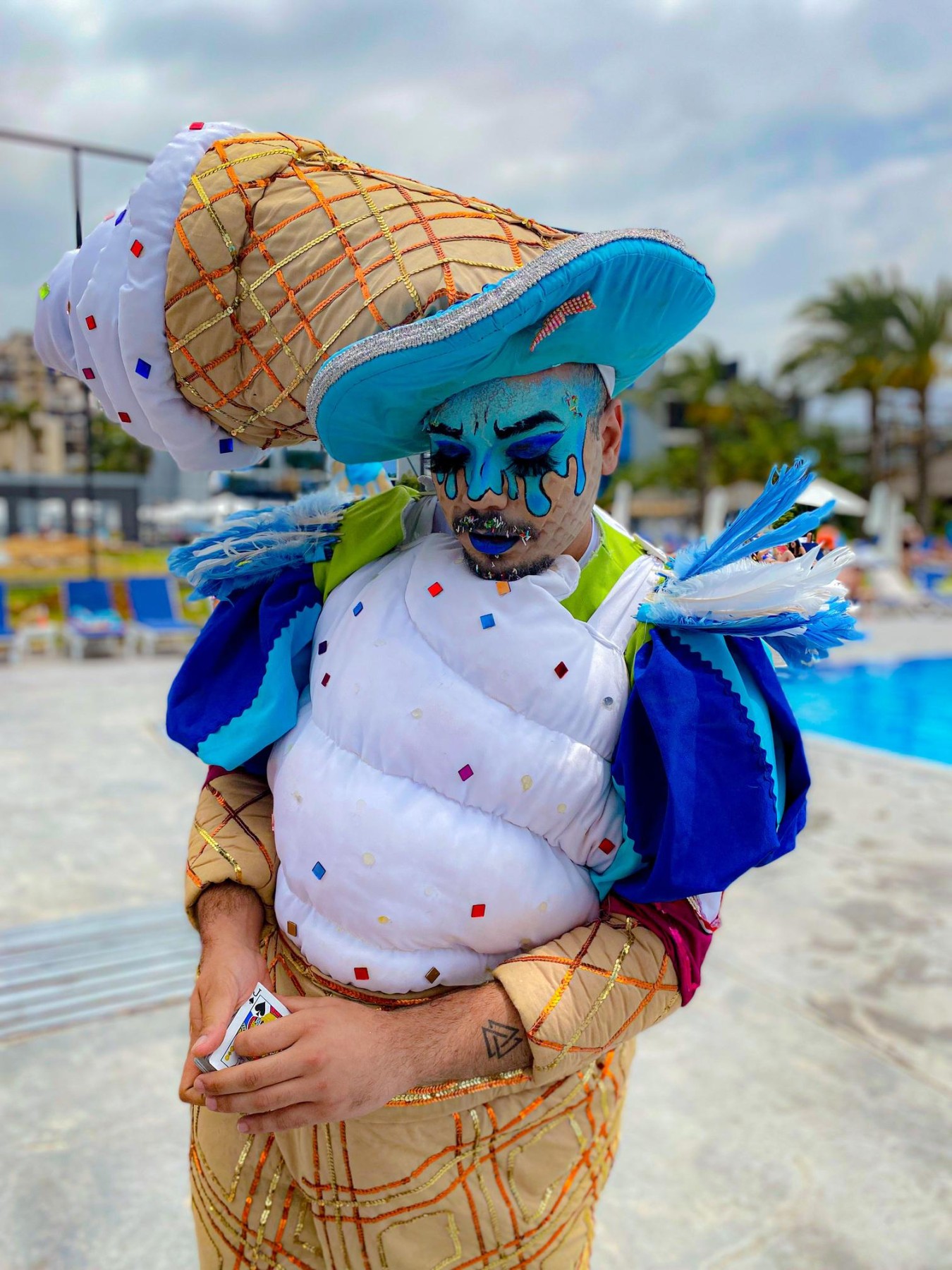 His vibrant and eye-catching ice cream cone man costume is a treat for the senses.