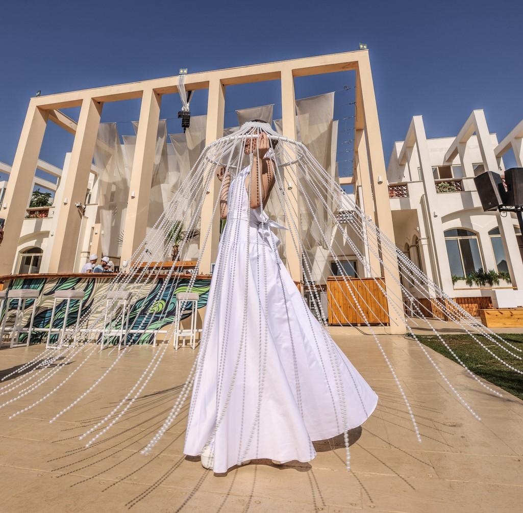 The dazzling pearl headpieces worn by the dancers add an extra element of visual allure, catching the light and casting a shimmering glow that enhances the magic of their performance.