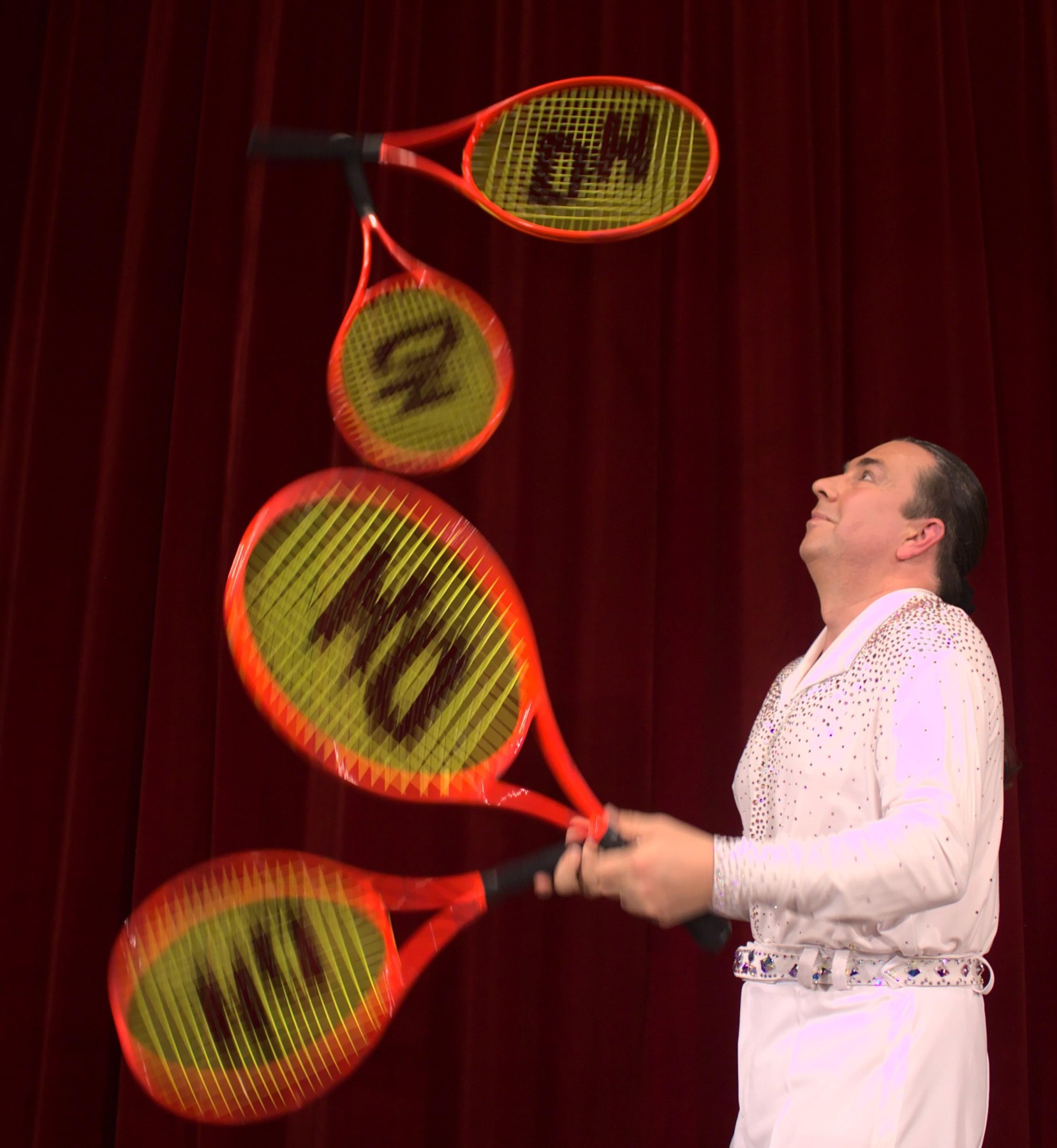 Perfect timing and precision, they juggle multiple tennis balls and tennis bats with flair, keeping audiences captivated with their dynamic performance.