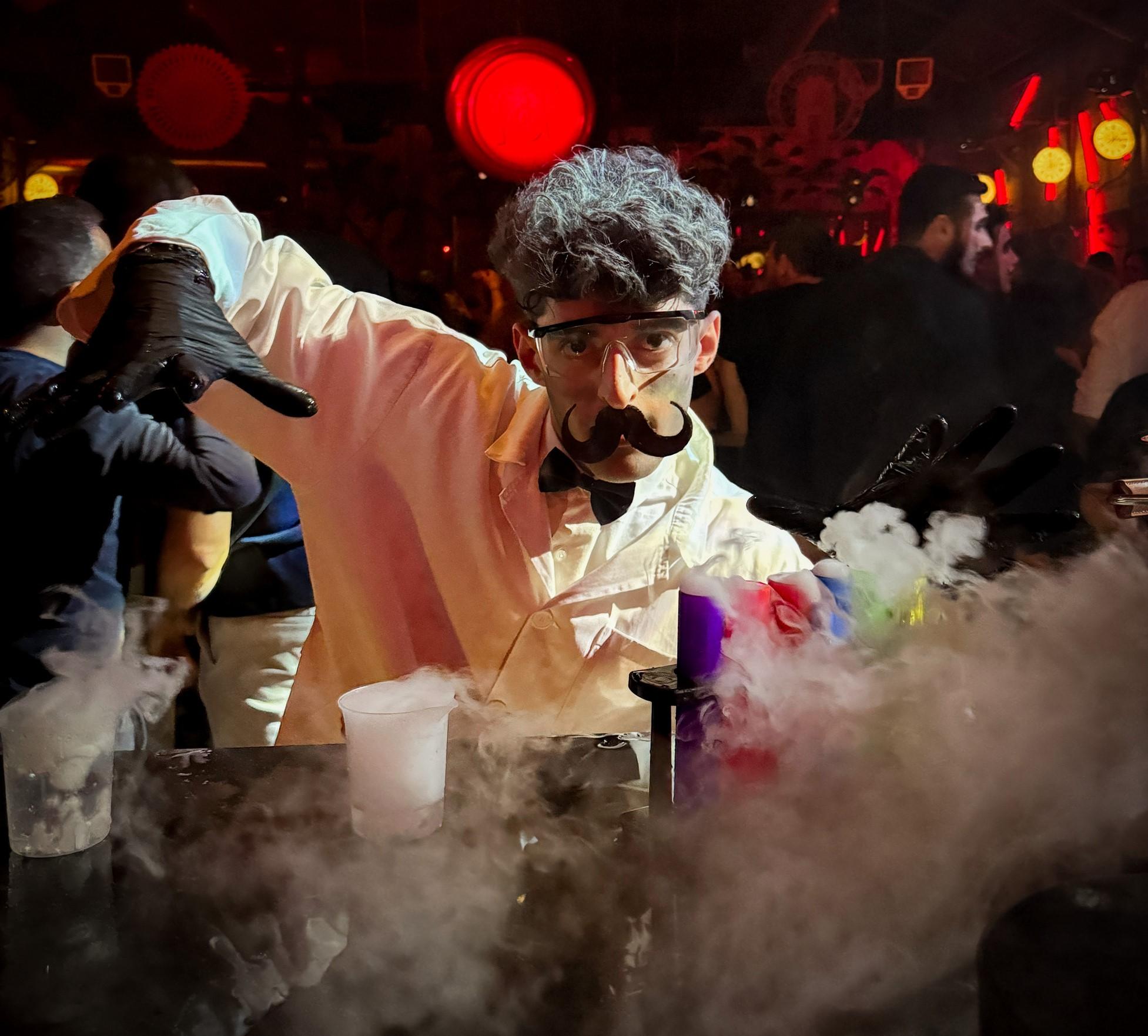 Meet the Mad Bar Scientist, an eccentric mixologist in a lab coat and goggles, ready to dazzle with spectacular experiments.