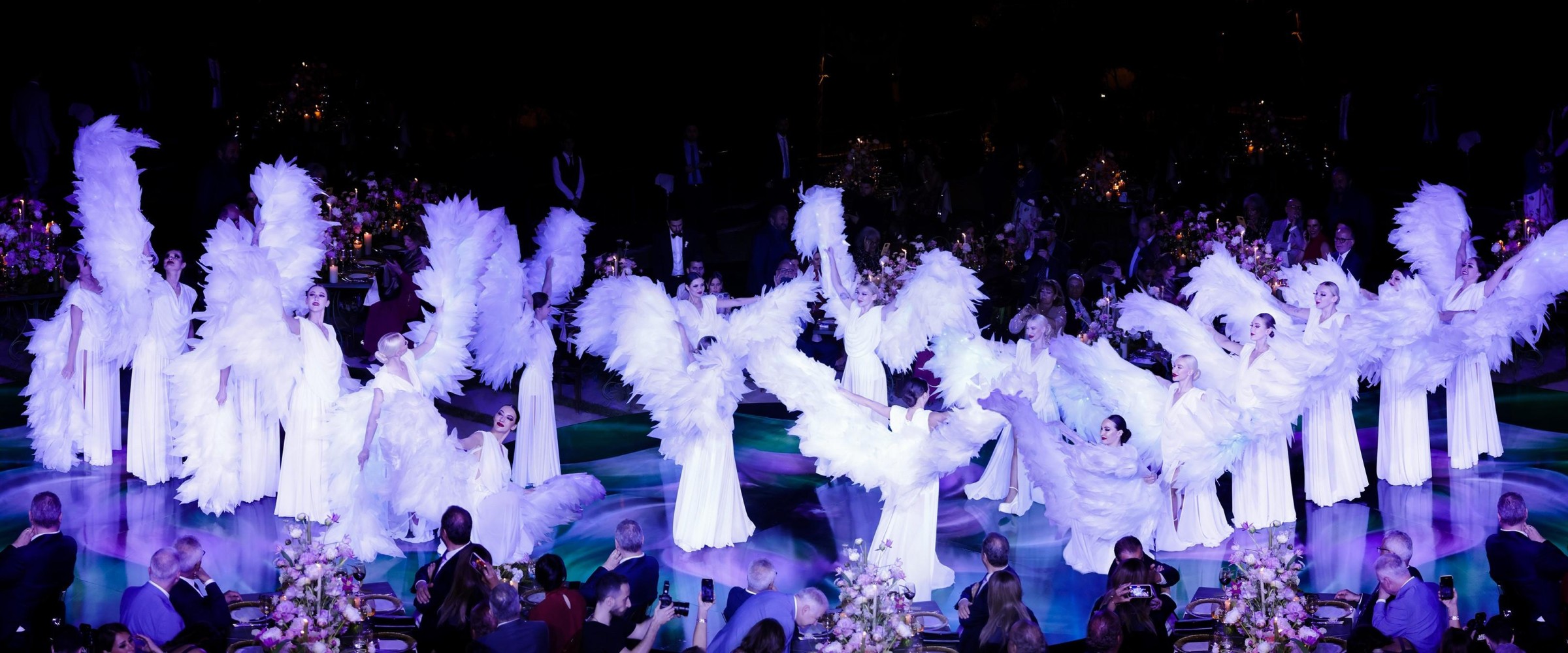 Performers are dressed in long, elegant white dresses adorned with elaborate, feather-like wings that extend from their arms, giving them the appearance of mystical birds.
