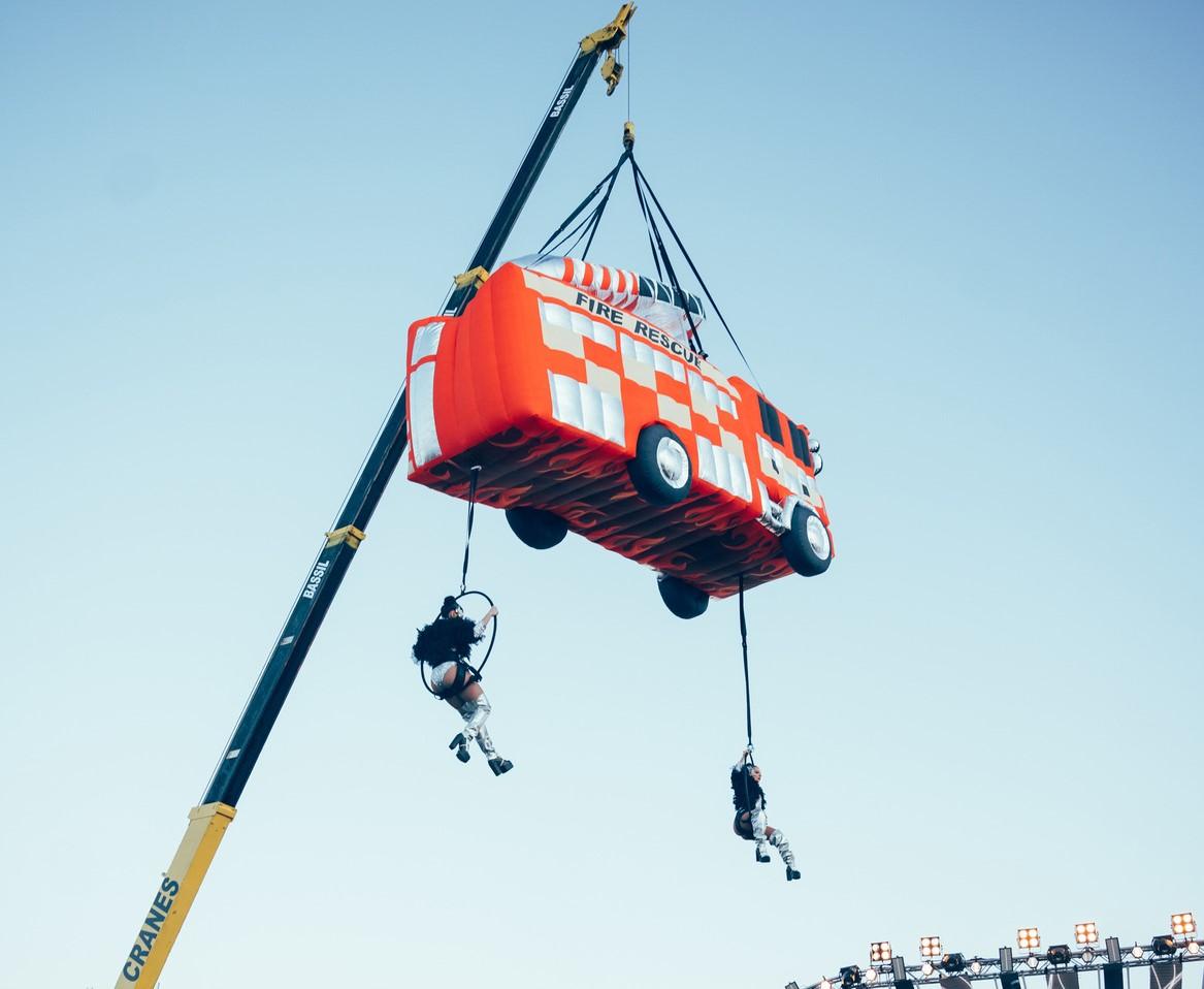 A unique aerial performance involving a creatively decorated firetruck suspended in mid-air.