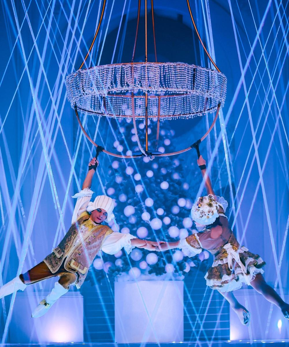 The Crystal Flyers soar gracefully beneath a dazzling chandelier of light.