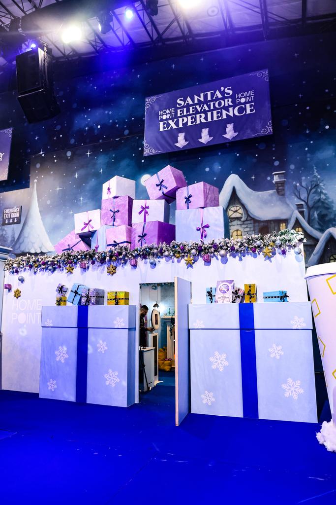 Kids step into a realistic elevator setting where screens create the illusion of traveling to Santa’s house.