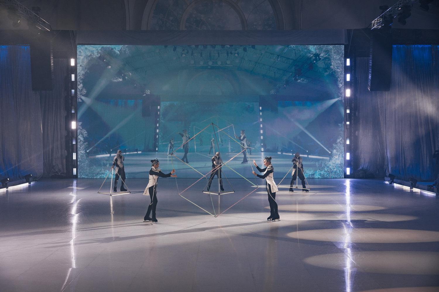 The acrobats juggle a set of illuminated LED cubes, each one glowing in bright, shifting colors.