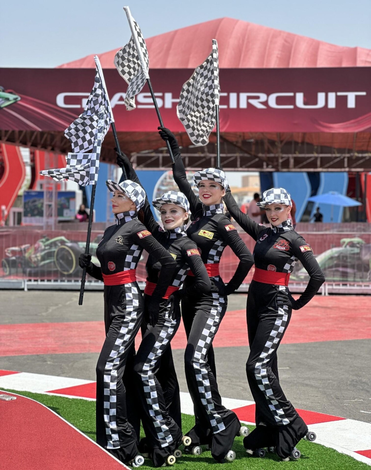 With checkered flags in hand and wheels at their feet, these racing divas bring high-speed glam to every corner of your event.