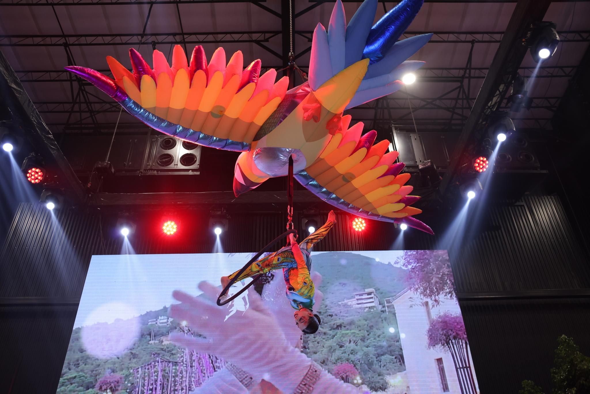 A breathtaking aerial act, suspended from a giant rainbow-feathered bird, soaring high above the stage.